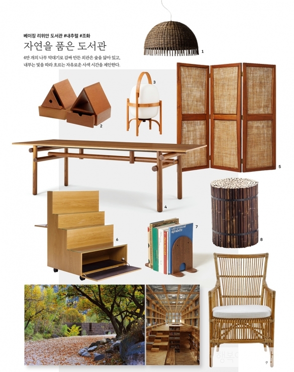 4 정교한 목재 구조에 절제된 현대적 라인을 결합한 뮤케 우드 컬렉션Muecke Wood Collection의 다이닝 테이블은 (www.knoll.com). 5 자연스러운 케인 위빙과 간결한 목재 프레임이 어우러져 공간에 따뜻한 온기를 더하는 라탄 스크린은 스위스 출신의 모더니즘 건축가이자 디자이너 피에르 잔느레Pierre Jeanneret의 작품으로 챕터원(070-8881-8006).