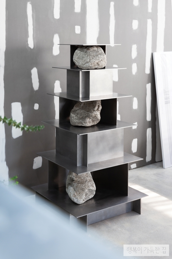 이시산의 작업은 산업 공정을 거친 뒤 버려진 금속 판재에서 출발한다. 그는 절단된 단면과 불규칙한 표면을 단순한 폐기물이 아닌 시간과 개성을 지닌 존재로 바라본다. 돌이나 나무처럼 본연의 물성을 존중하며, 다시 깎거나 다듬지 않고 즉흥적으로 맞추고 겹치는 방식으로 조형을 완성한다. 금속 조각은 의자의 다리나 테이블의 일부가 되며, 잔재를 넘어선 새로운 덩어리의 힘을 드러낸다. 산업의 파편이 자연의 일부로 수용되는 순간, 조형은 완성된 형태가 아니라 관계 속에서 생성되는 과정으로 변모한다. 생명 있는 것과 없는 것, 유기적과 무기적, 다듬은 것과 거친 것의 경계 위에서 그는 묻는다. 무엇을 남기고 무엇을 흘려보낼 것인가. 날카롭고 직선적인 금속 선반을 받치는 돌은 이 대비 속에서 묘한 균형감을 드러낸다. 이러한 문제의식은 레오킴 스튜디오에서 열리는 듀오전 (9월 6~30일)에서 구체화되었고, 작품은 형태보다 과정과 재료의 본질을 탐구하는 자리에서 관객과 만났다.
