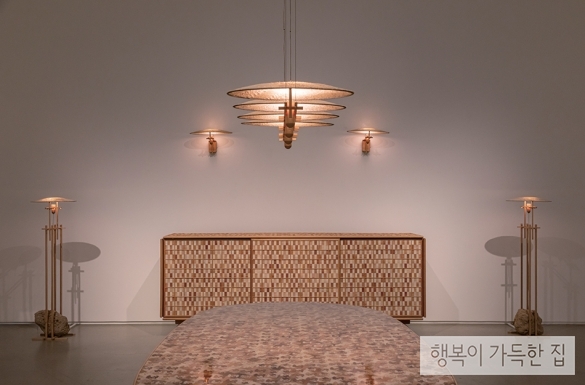 맞습니다. 이번 전시에서 그런 편안함을 공간 전반에 담아내고자 했습니다. 테이블, 램프, 캐비닛을 배치해 관람객이 거실에 머무는 듯한 경험을 하게 하고 싶었죠. 특히 멕시코 원주민 공예가 지닌 ‘단순함과 불완전함을 받아들이는 태도’를 아시아 철학과 연결하고 싶었습니다. 최근 루파(수세미) 램프 작업을 다시 시작하면서도 그러한 미학이 아시아 전통과 깊이 공명한다고 느꼈어요. 제 작업은 재료의 본질을 드러내되 완벽을 추구하지 않는 데서 출발합니다. 일본의 쇼지 스크린이나 구미코 기법처럼 반복되는 사각형, 단순한 직선, 기하학 구조에서 영감을 받았지만 단순히 복제하는 대신 고유한 기술로 재해석하죠. 또한 이번 전시작의 상당수는 음식 재료를 활용해 제작했는데, 멕시코의 전통 제례와 축제에서 음식은 영적 상징성을 지닙니다. 이러한 맥락은 한국 관객에게도 깊은 울림을 줄 것이라 생각합니다.