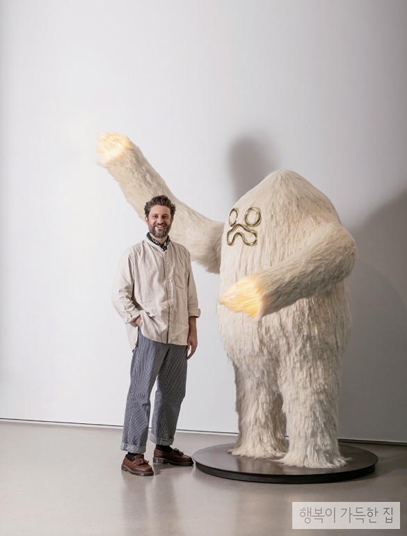 이번 개인전을 위해 서울을 찾은 페르난도 라포세. 아가베잎에서 얻은 천연섬유를 이용해 털이 난 듯한 조각 작품이자 램프 ‘Patachon’을 만들었다. 멕시코 괴물 전설에서 영감을 받은 작품이다. ‘Patachon’, agave fibers, brass, 3D printing filament, plywood, steel structure, 178×220×110cm, 2024.