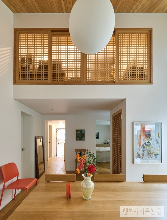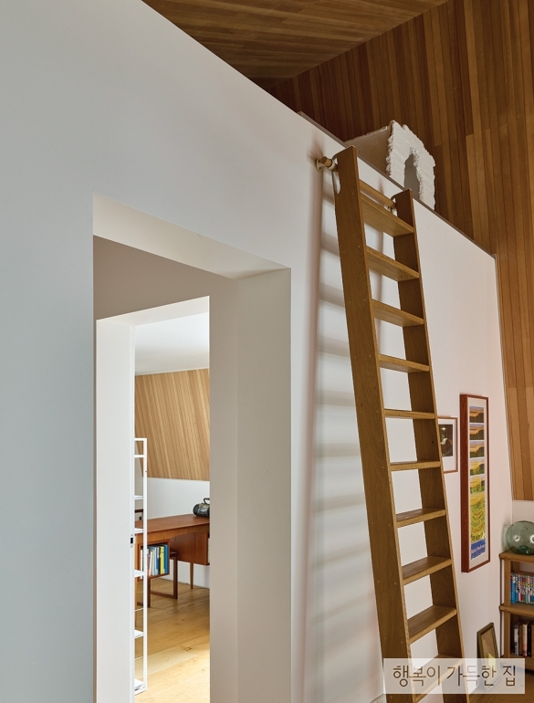 외관은 여기저기 새시를 덧대어 인위적으로 확장한 공간을 정리해 집의 원형을 되찾는 정도로만 손을 댔고, 내부는 벽의 배치만 유지하고 완전히 새로 고쳤다. 경사 지붕의 탁 트인 층고를 살리지 못한 채 평천장으로 막혀 있던 천장 구조체를 모두 뜯고 시원한 공간감을 확보한 것은 레노베이션의 가장 큰 성과였다. 적막한 기운이 감돌던 집은 건축가의 손길을 거쳐 잃어버린 빛과 조망을 되찾았다. 바닥과 계단, 가구는 화이트 오크, 벽은 하얀색 페인트, 지붕은 옹이가 없는 소프트 우드로 마감해 단정해진 집에 따뜻한 기운을 불어넣었다.