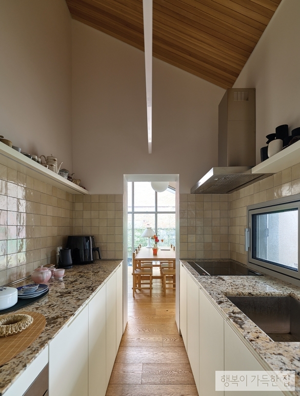 물성의 조화가 돋보이는 주방. 마음에 둔 석재를 구입해 주방 상판으로 사용했다.