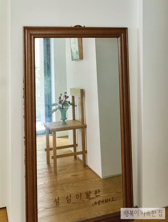 집에는 시간이 담긴 물건이 곳곳에 자리해 있다. 거울은 철거 예정인 개포동 주공아파트 단지에서 프로젝트를 하던 중 사라지는 것이 아쉬워 챙겨온 그곳의 흔적 중 하나다.