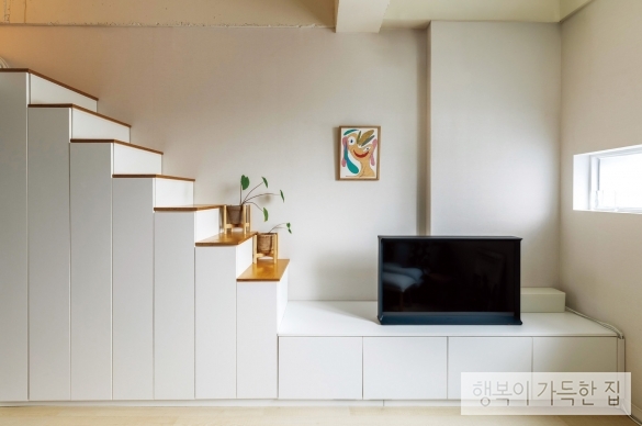 거실 한쪽에는 수납공간이자 비밀의 장소로 올라가는 계단이 있다. 벽에는 승태 씨가 좋아하는 이탈리아 브랜드 써네이SUNNEI와 그래픽 디자이너 가브리엘레 차갈리아Gabriele Zagaglia가 협업해 배포한 포스터를 걸어놓았다.