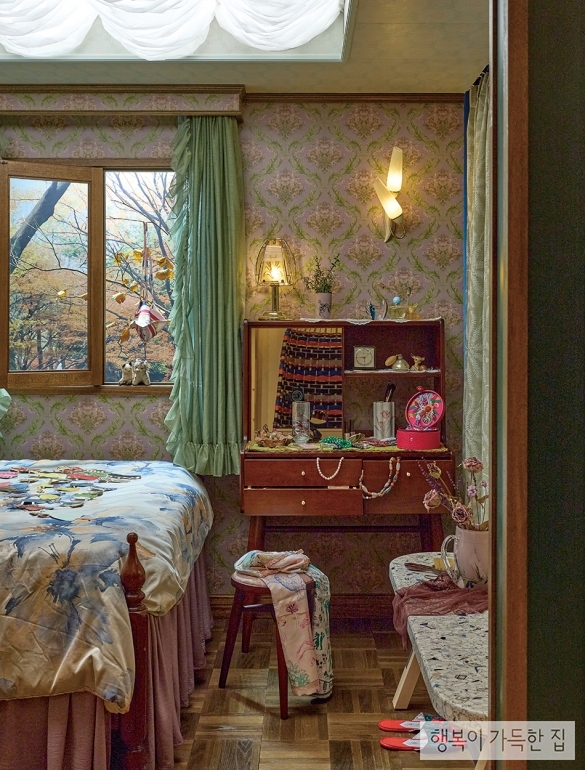 엄마가 거실에서 손을 분주히 움직이면 케이크와 딸기잼이 완성됐다. 왼쪽의 패치워크 항아리, 가운데에는 탈착 가능한 포켓이 더해진 테이블, 우측 선반 위 말 모양 오브제는 모두 쁘띠 아쉬 제품. 이외에도 곳곳에 쁘띠 아쉬 제품이 놓여있다.