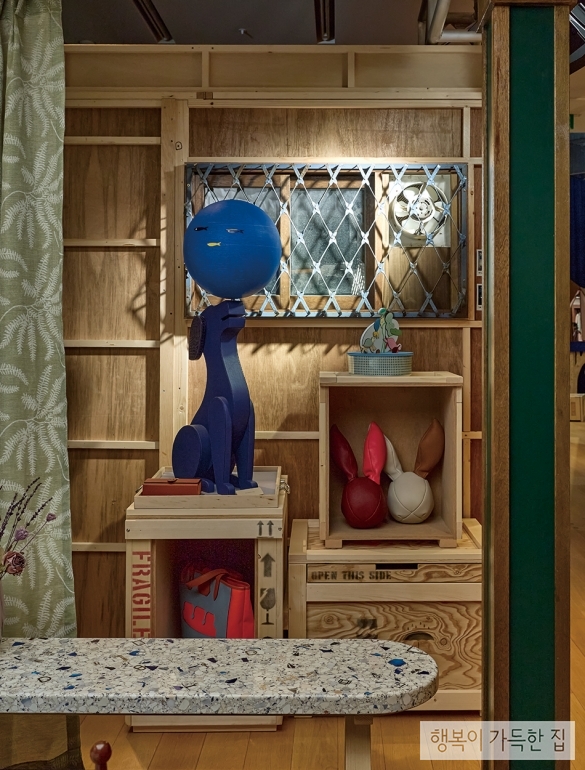 우리는 모두 인생이란 세트장에서 주역 자리에 서는 날을 맞이할 테다. 무대 뒤에서 자신의 차례를 기다리는 강아지 모티프 지구본 오브제, 그 아래 캔버스 및 가죽 소재 가방, 토끼 모티프 문진, 그 위에 거북이 모티프 장식용 보관함, 바로 앞 테라조 테이블 모두 쁘띠 아쉬 제품.