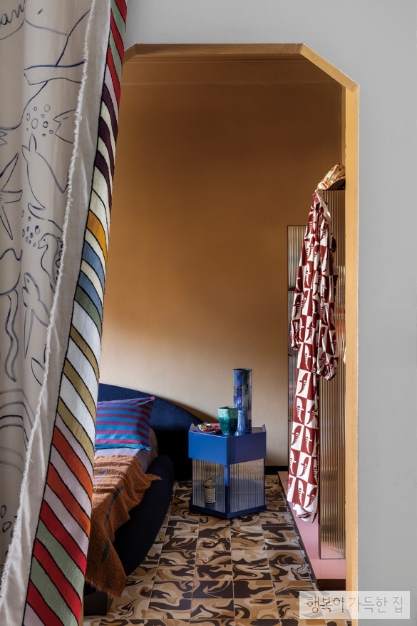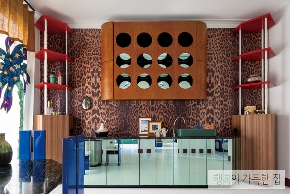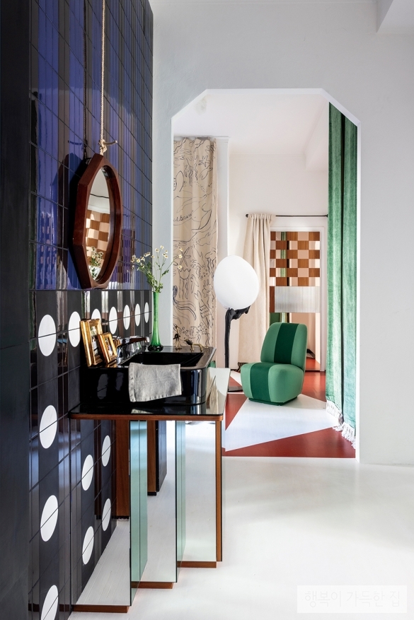 그 ‘느림의 미학’은 현관에서 시작된다. 집에 들어서면 가장 먼저 눈에 들어오는 것은 조 폰티Gio Ponti의 세면대다. 층층이 쌓인 거울장 위에 놓인 세면대는 세라믹 타일로 장식한 줄무늬와 원형 패턴의 벽을 배경으로, 마치 ‘걱정을 씻어내는 의식’에 초대받은 듯한 인상을 준다. 이어서 아라베스크와 고딕 양식이 섞인 뾰족한 아치형 입구를 지나면 세 개의 주요 공간이 펼쳐진다. 이국적인 동물 무늬가 돋보이는 주방, 모로코의 안뜰을 연상시키는 거실, 그리고 옷장과 바bar로 변신하는 다목적 공간이다. 문이 없는 개방형 구조 덕분에 공간의 경계는 흐릿해지고, 자연스러운 이동을 유도한다.