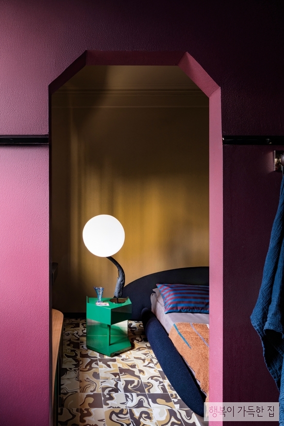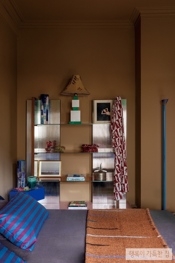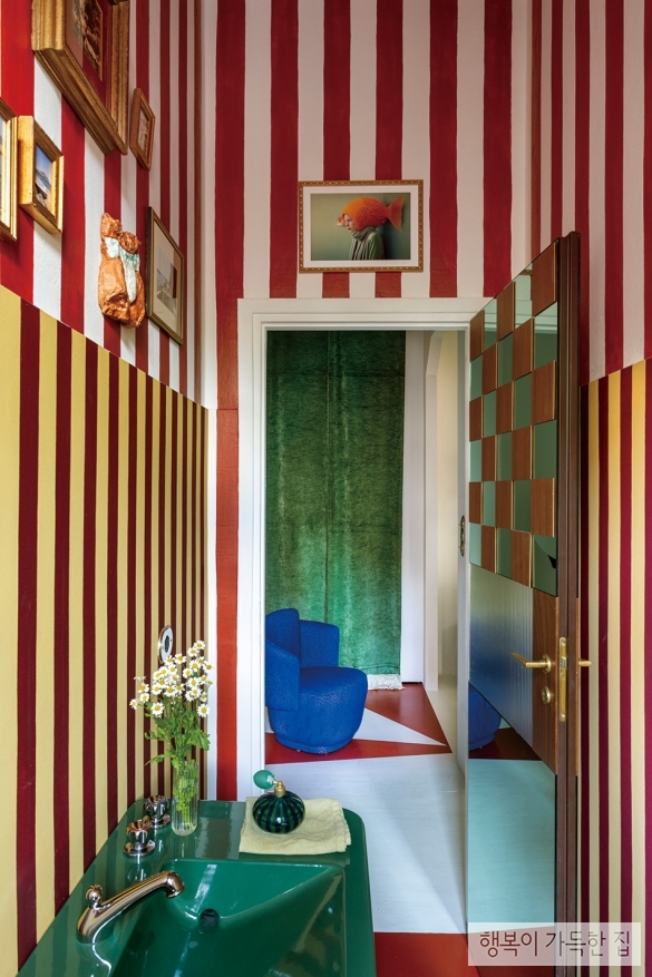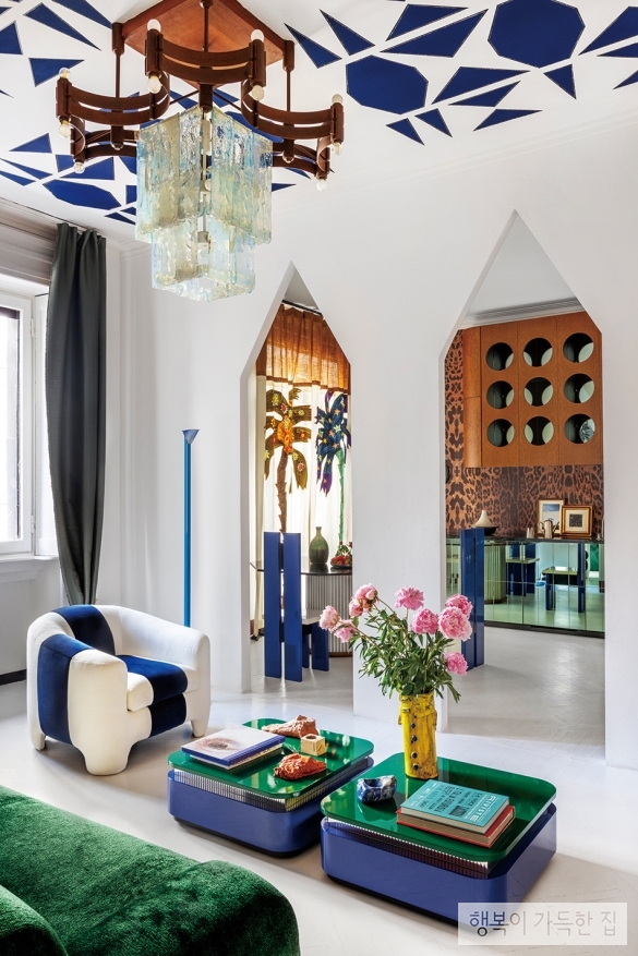 이러한 그의 디자인 철학은 밀라노 자택 카사 오르넬라에서 가장 뚜렷하게 드러난다. 밀라노 5비아 지구의 비아 콘카 데 아미치스Via Conca De Amicis에 자리한 이 집은 그의 내면세계를 시각화한 듯한 공간이다. 포르타 티치네세Porta Ticinese와 나빌리Navigli 사이에 위치한 이 거리는 고대 로마 유적지와 맞닿은 역사 깊은 주거 지역으로, 현재 도시 재생이 활발하게 진행되고 있다. 20세기 초·중반의 밀라노식 신고전주의와 합리주의 건축이 밀집해 있는 곳. 석재 외벽과 아치형 창, 철제 발코니 난간이 인상적인 동네다. 최근에는 이러한 구조적 특징을 유지한 채 현대적 미니멀리즘으로 레노베이션한 아파트가 늘고 있다. 그중에서도 마리아의 집은 단연 돋보인다. 도시의 맥락 속에서 색채, 질감, 가구, 벽면 그래픽이 하나의 리듬을 이루고 있다.