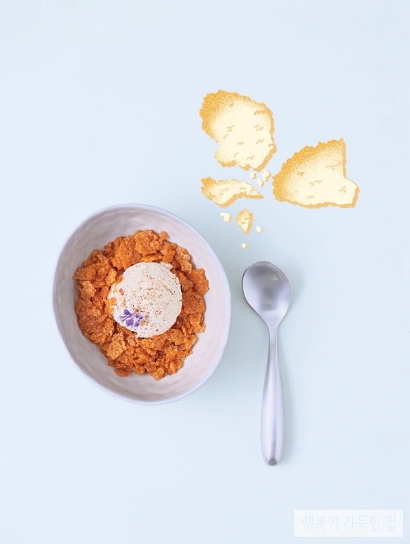 3 ②의 아이스크림 위에 식용 꽃을 올려 장식한다. 후춧가루나 올리브유를 뿌려도 잘 어울린다.