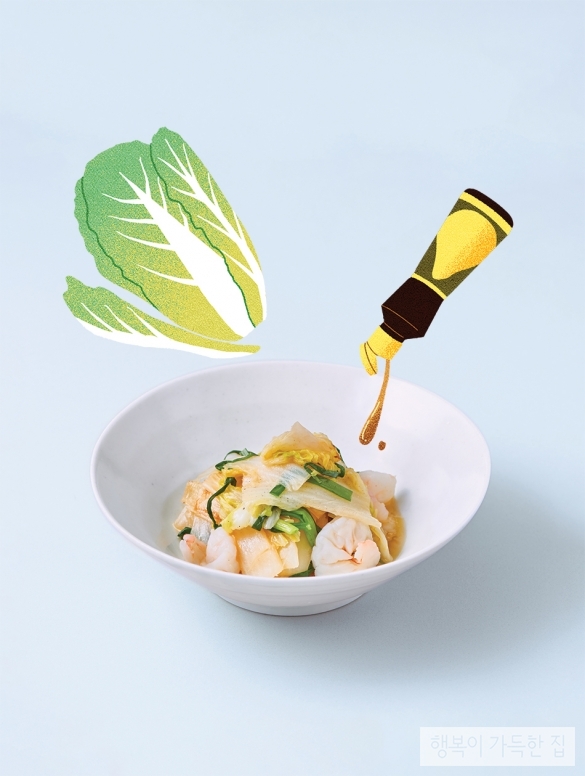 3 바닥이 두꺼운 냄비에 들기름을 두르고 ②의 배추속대를 넣어 달달 볶다가 ①의 새우와 쪽파를 넣고 볶는다. 여기에 물을 1컵 정도 부어서 거의 없어질 때까지 볶아서 뜸을 들인 후 그릇에 담는다.