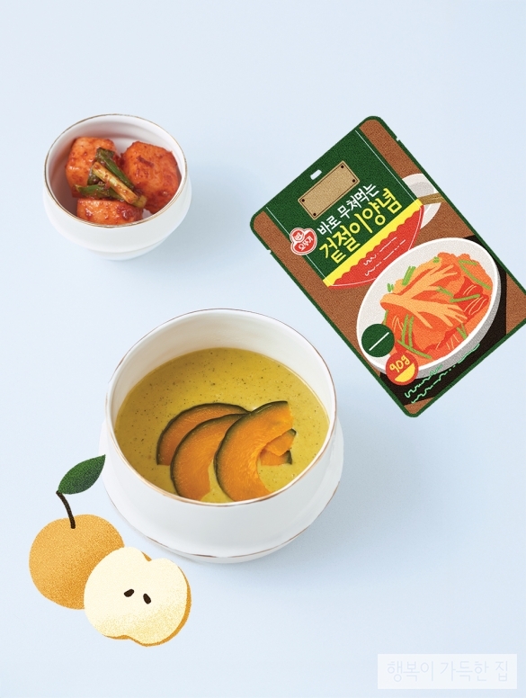 한국 요리는 여러 맛이 서로 어우러져 조화를 이루는 데 맛의 큰 특성이 있다. 그렇다고 김치만 먹을 수는 없는 노릇. 특히 손님상의 첫 코스라면 더욱 그렇다. 이럴 때 유용한 간편식이 크림스프다. 여기에 사시사철 흔하지만 딱 요맘때가 제철인 단호박과 우유를 넣어 만들면 맛과 영양을 겸비한 스프로 제격이다. 시원한 배를 깍둑썰기해서 겉절이양념에 바로 버무린 별미 김치를 곁들여 새롭게 즐겨보자. 이때 겉절이양념은 직접 만들면 2~3일간 숙성시켜야 제맛이 들므로 시판 양념을 활용하면 간편하다.