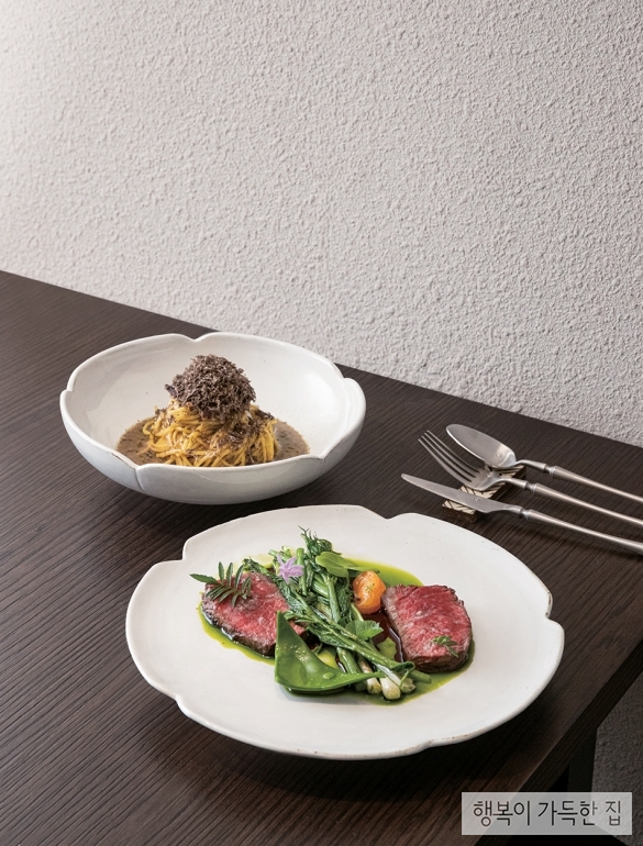 시그너처 메뉴인 트러플 고사리 파스타와 한우 채끝 스테이크 코리안 시즌.