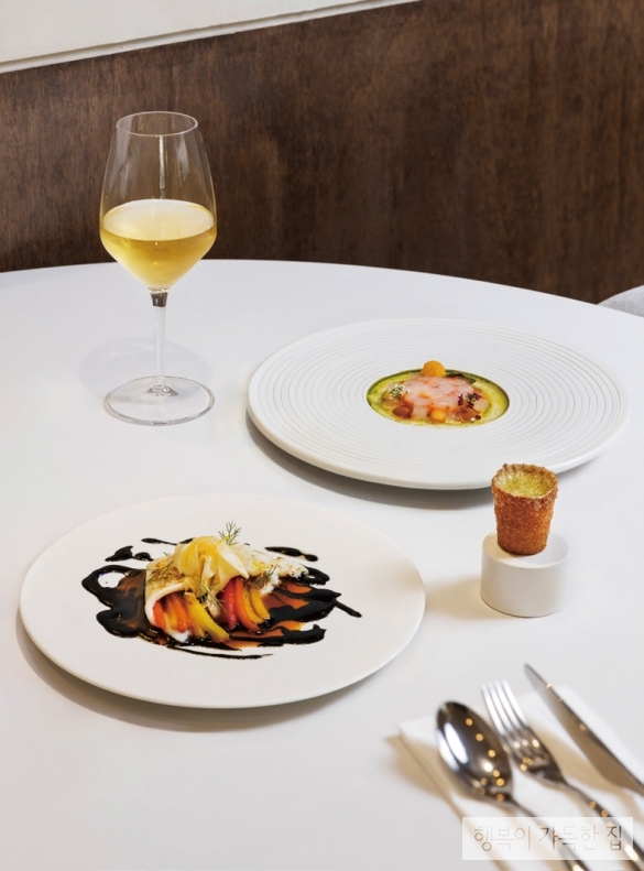 국내 프렌치 파인다이닝과 덴마크 미쉐린 레스토랑 마르브&벤Marv&Ben에서 경험을 쌓은 황형선 셰프. 최근 용산에 노르딕 다이닝 레스토랑 솔른을 오픈해 덴마크 요리를 재해석한 메뉴를 선보인다. 프렌치를 기반으로 황형선 셰프가 덴마크에서 체득한 감각을 자연스럽게 결합한 것이 특징. 새로운 조합과 시도를 통해 자신만의 색을 입힌 요리를 풀어낸다. 특히 발효와 피클링이 핵심 요소인데, 겨울이 길고 추운 북유럽의 식문화를 가져온 것. 코스의 시작은 덴마크 유학 시절의 시그너처 디시를 오마주한 파이티. 알감자와 파슬리 마요네즈, 피클링한 파슬리 줄기를 한 입 크기로 담아낸다. 이어 달마새우와 피클링한 사과를 활용한 콜드 애피타이저가 산뜻한 균형을 잡아준다. 메인 요리인 오리 스테이크는 비트·체리 퓌레와 태운 고추, 초콜릿, 향신료로 만든 멕시코식 몰레 소스를 곁들여 깊은 풍미를 완성한다. 마지막으로 덴마크 전통 디저트 두 가지를 내며 노르딕 다이닝의 정체성을 잇는다. “노르딕 푸드가 뭔지 묻는 분이 많아요. 생소한 음식이라도 자연스럽게 받아들이도록 풀어내려 해요. 감자, 오리, 오징어처럼 익숙한 재료를 새롭게 조합해 색다르지만 편안하게 느끼도록 하고 싶어요. ” 공간 역시 차분한 색감과 부드러운 곡선이 어우러져 식사하기 좋은 편안한 분위기를 완성했다.