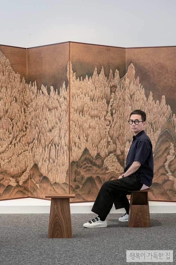특별전이 진행 중인 진주시립이성자미술관 제2관의 스툴은 작품의 연장선처럼 느껴졌는데요, 이유가 있을까요? 성파 스님의 작품은 스케일이 꽤 큽니다. 세밀히 들여다볼 때 발견할 수 있는 것이 무궁무진하죠. 실제로 앉아서 바라보면 멀리서는 안 보이던 게 보여요. 가령 물이 흐르는 모양이랄지, 물결이 흐르는 방향 같은 것이 말이죠. 그런 의미에서도 스툴은 필수였는데요, 차이가 있다면 주 전시의 스툴은 존재하는 듯 존재하지 않는 듯한 심플한 느낌이 필요한 반면, 성파 스님의 작품 앞 의자는 있는 듯 없는 듯 존재하는 게 아니라 작품과의 연속성이 필요했어요. 그래서 성파 스님 작품과 최대한 유사한 색과 결을 지닌 나무를 찾는 데 심혈을 기울였죠.