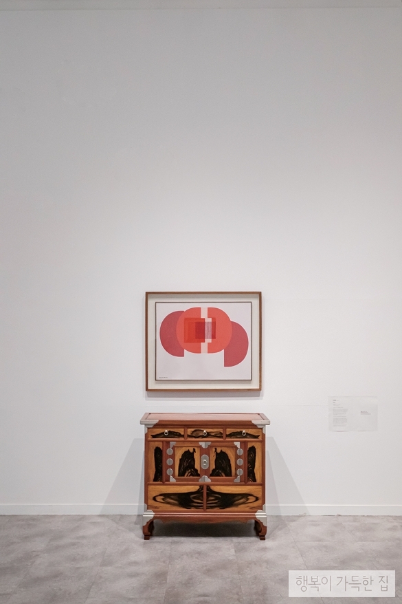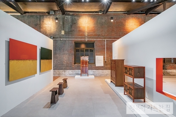 한편 진주역 차량정비고에서 약 5km 정도 떨어진 곳에 있는 진주시립이성자미술관에서는 특별전 두 개가 열린다. 제1전시실에서 열리는 은 현대 추상미술의 대가이자 1991년과 2002년, 프랑스 정부로부터 문화 예술 공로 훈장 ‘슈발리에장’과 ‘오피시에장’을 받은 이성자 작가와 진주 소목 장인의 컬래버레이션 전시로, 전통과 현대 사이의 감각적 교차를 통해 이번 비엔날레의 주제 의식을 선명하게 보여준다. <일무, 그 길 너머로> 전시가 진행 중인 제2전시실에는 이성자 작가와 성파 스님의 인연을 기억하며 두 거장의 대형 회화 작품이 관람객을 맞이한다. 제2전시실에 놓인 스툴은 흡사 그림의 연장처럼 연출했다.