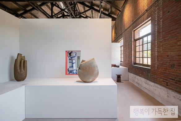 정면에 보이는 작품은 류남희 도예가의 도자 작업. 전시장에는 오준식 미술감독과 소목장이 협업해 만든 스툴이 곳곳에 놓여 있다. 창 너머로 보이는 작품은 김정범 도예가의 '우기청호'.