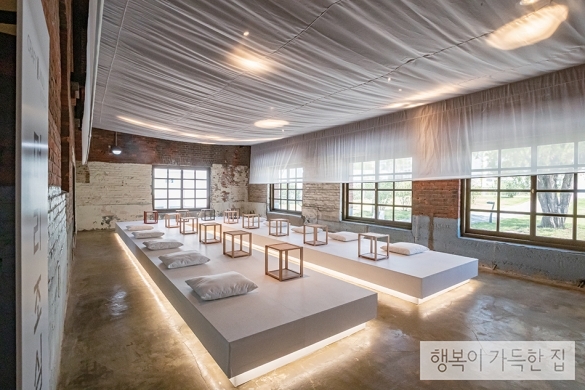 이어지는 맥락입니다. 관람객과 공예품 사이의 간격을 좁히고자 전시장에 가벽을 설치해 동선을 만들었어요. 차량정비고는 커다란 기차가 정비를 위해 들락날락거리던 큰 스케일의 공간인데요, 덩그러니 작품을 놓으면 관람객에게는 작품보다 공간감이 더 크게 다가갈 수 있는 구조였죠. 대비가 워낙 크니까요. 다만 전시장 동선 모서리 사이를 막지 않고 틈을 만들어 근대 건물이 지닌 공간감과 올곧은 매력도 충분히 느낄 수 있게 했어요. 의자에 앉아 가벽 곳곳으로 보이는 창을 바라보면 서 있을 때는 시야에 들어오지 않는 중첩된 장면이 눈 앞에 펼쳐집니다. 창에 칠한 색은 진주성 단청에서 영감을 받아 골랐습니다.