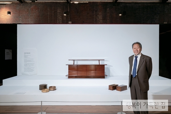 일본 목공 분야 중요무형문화재 인간 국보 미야모토 테이지가 자신의 작품 앞에서 포즈를 취하고 있다.